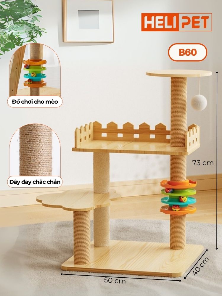 - The HELIPET B60 cat tree is made from high-quality engineered wood with a smooth surface and attractive natural wood grain. The sturdy frame ensures the product can withstand the weight of cats climbing or engaging in vigorous activity.