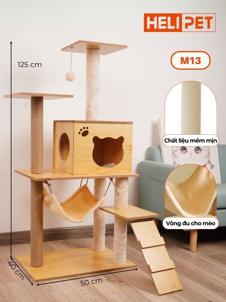 - The HELIPET M013 cat tree is made from high-quality engineered wood with a smooth surface and attractive natural wood grain. The sturdy frame ensures the product can withstand the weight of cats climbing or engaging in vigorous activity.