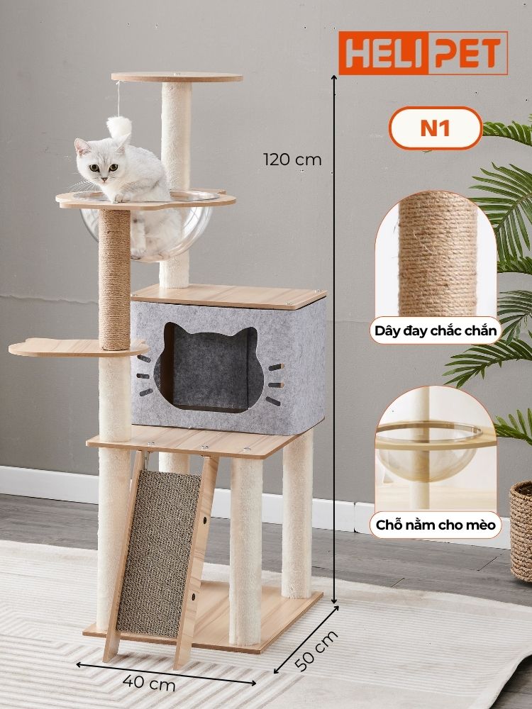 - The HELIPET N1 cat tree is made from high-quality engineered wood with a smooth surface and attractive natural wood grain. The sturdy frame ensures the product can withstand the weight of cats climbing or engaging in vigorous activity.
