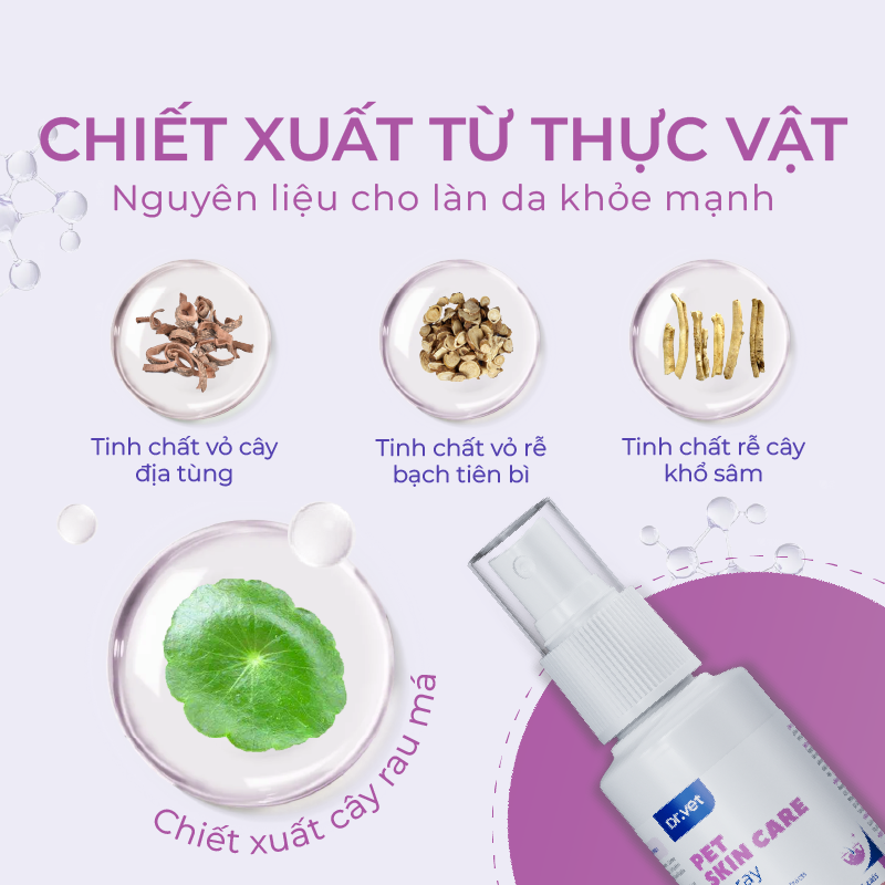 DrVet Pet Skin Care Spray for dogs and cats is extracted from natural herbal ingredients such as pine bark, mugwort, centella asiatica, and Sophora flavescens root – offering outstanding benefits: