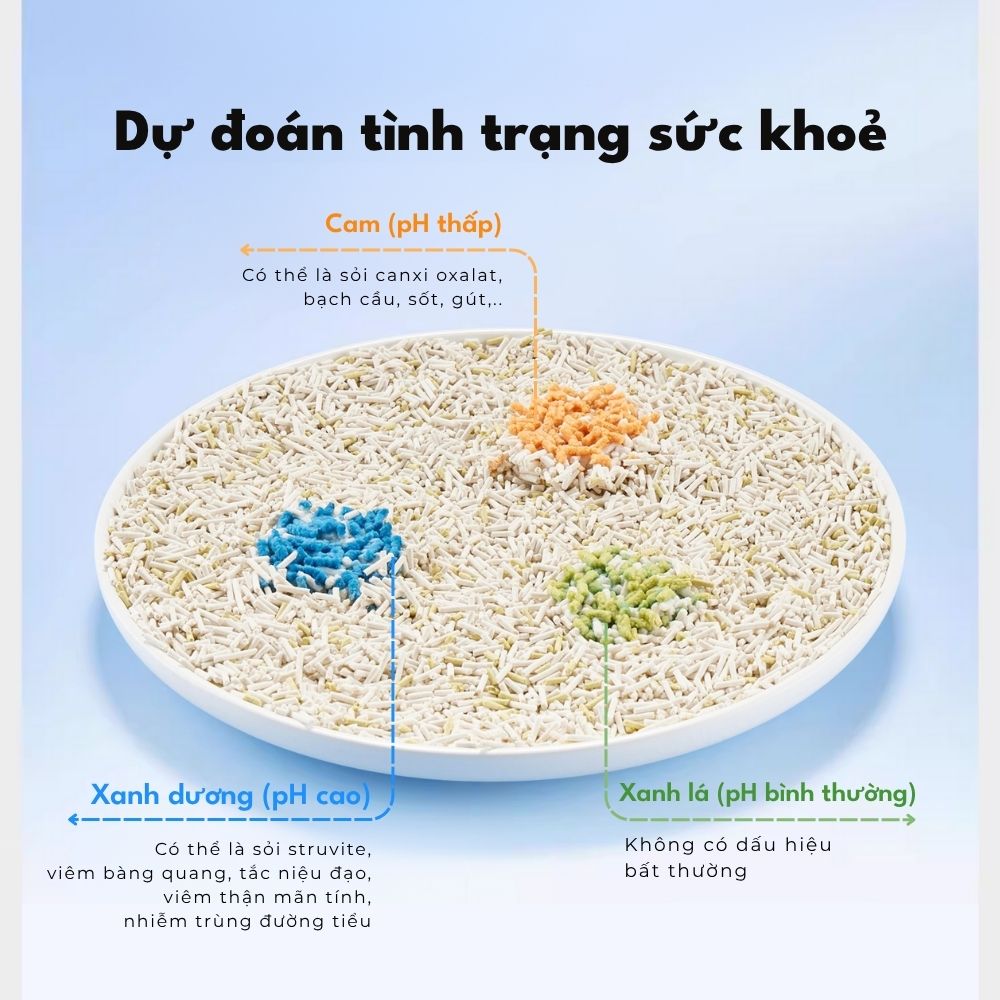 PETKIT cat litter with urine monitoring is a premium cat litter line that incorporates a pH testing feature , allowing you to monitor your cat's urine pH at home – helping to detect urinary tract problems such as inflammation or bladder stones early. When your cat urinates, the litter changes color after only 3 seconds , easily observed with the naked eye.